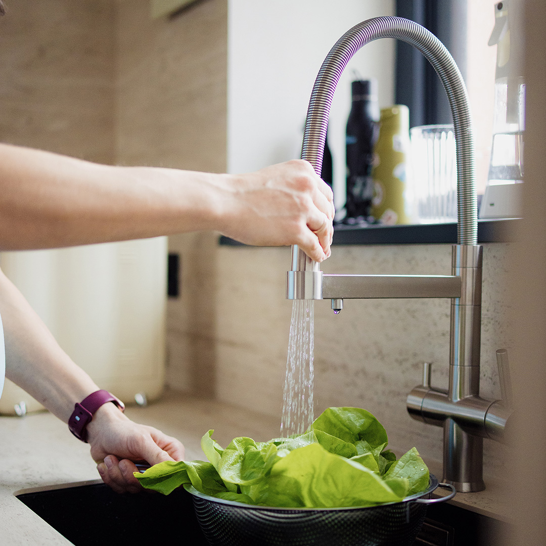 Specijalna česma za sudoperu sa odvojivim tušem koja ima dodatnu opciju da se poveže sa filterima za vodu ispod sudopere.